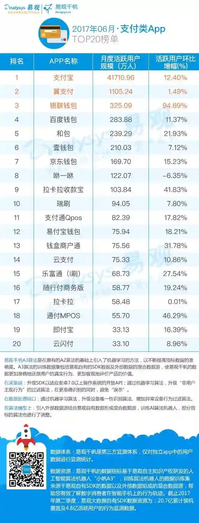 在2017年6月金融App基础指标数据上,支付领域App活跃用户均取得较大幅度增长,8家支付企业排名进入前100位。其中,支付宝、翼支付、银联钱包和百度钱包在月活人数上增长较为迅速。