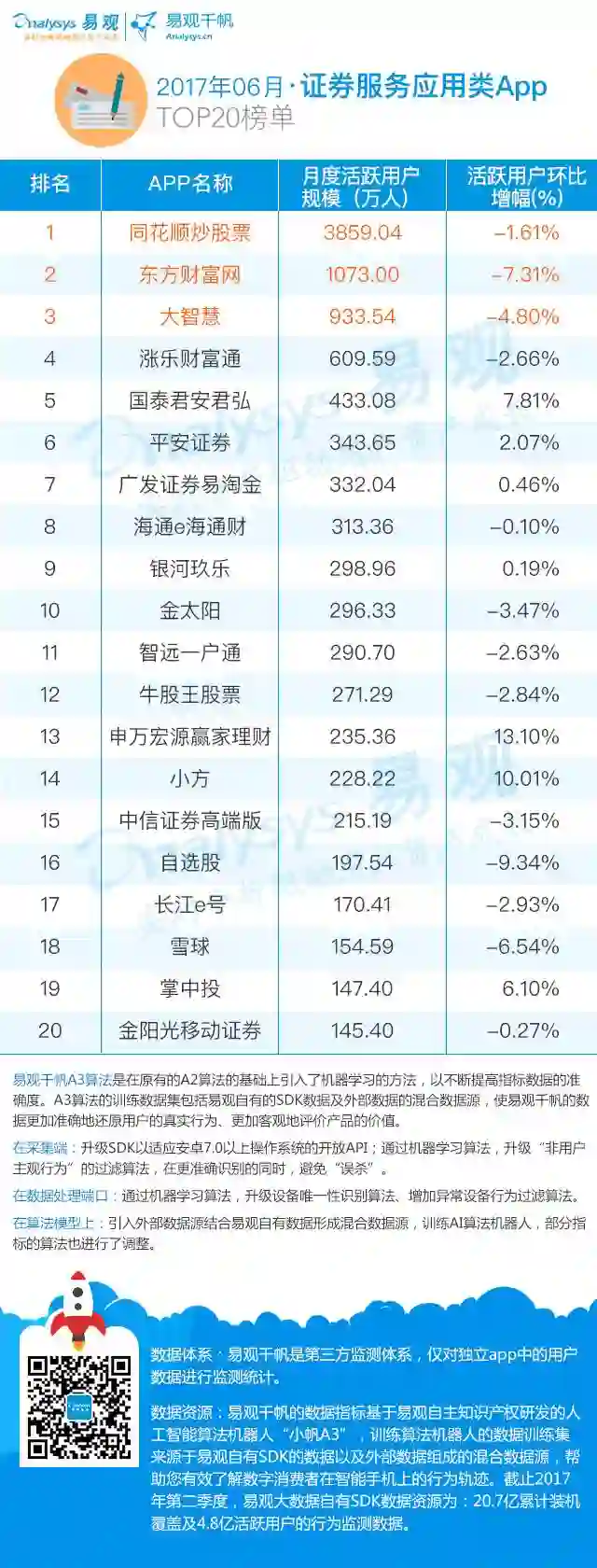 在证券服务领域中,第三方机构依靠不断优化提升对客户体验,占领了很大的市场份额,证券行业中App活跃用户排行榜前三的依次是同花顺、东方财富和大智慧。
