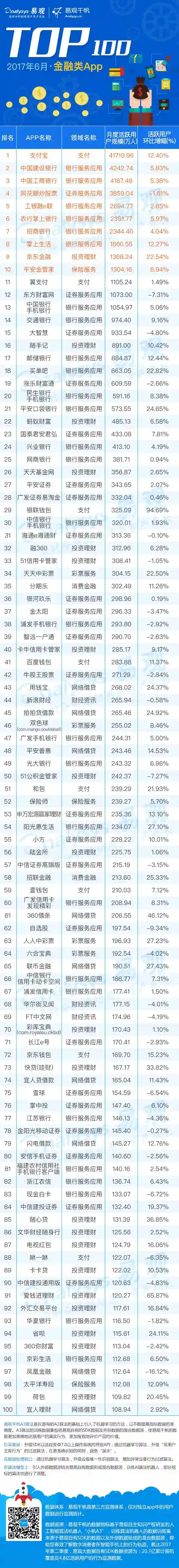 2017年6月金融市场运行相对平稳,政策支持力度也在加大,在Top100金融类应用的数据中也得到了一定程度的反映。本月金融领域用户活跃规模变化呈现乐观上涨态势。