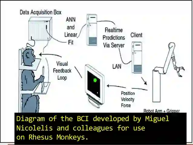 最初,他们在一只恒河猴身上进行了试验:他们把猴子和机械臂进行关联,然后让机械臂实时模拟猴子的动作。很快,猴子学会了这 一套操作,并似乎某种程度上理解了这种操控。与此同时,他们记录了玩游戏时猴子脑内100个神经元的活动,这是第一步;