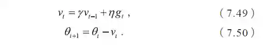 为了解决随机梯度下降法山谷震荡和鞍点停滞的问题,我们做一个简单的思维实验。想象一下纸团在山谷和鞍点处的运动轨迹,在山谷中纸团受重力作用沿山道滚下,两边是不规则的山壁,纸团不可避免地撞在山壁,由于质量小受山壁弹力的干扰大,从一侧山壁反弹回来撞向另一侧山壁,结果来回震荡地滚下;如果当纸团来到鞍点的一片平坦之地时,还是由于质量小,速度很快减为零。纸团的情况和随机梯度下降法遇到的问题简直如出一辙。直观地,如果换成一个铁球,当沿山谷滚下时,不容易受到途中旁力的干扰,轨迹会更稳更直;当来到鞍点中心处,在惯性作用下继续前行,从而有机会冲出这片平坦的陷阱。因此,有了动量方法,模型参数的迭代公式为