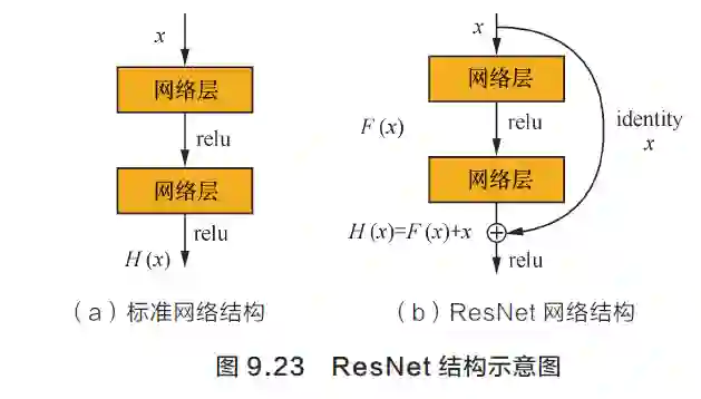 ResNet过调整网络结构来解决上述问题。首先考虑两层神经网络的简单叠加(见图9.23(a)),这时输入x 经过两个网络层的变换得到H(x),激活函数采用ReLU。反向传播时,梯度将涉及两层参数的交叉相乘,可能会在离输入近的网络层中产生梯度消失的现象。ResNet 把网络结构调整为,既然离输入近的神经网络层较难训练,那么我们可以将它短接到更靠近输出的层,如图9.23(b)所示。输入x经过两个神经网络的变换得到F(x),同时也短接到两层之后,最后这个包含两层的神经网络模块输出H(x)=F(x)+x。