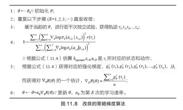 其中sk,ak 为轨迹τ 上每一步的状态和动作。这样,给定一个策略πθ,我们可以通过模拟获得一些轨迹,对于每条轨迹,可以获得其收益r(τ) 以及每一步的<状态、行动>对,从而可以通过式(11.2)和式(11.3) 获得当前参数下对梯度的估计。一个简单的算法描述如图11.7 所示。