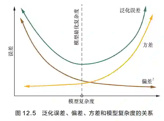 关于泛化误差、偏差、方差和模型复杂度的关系如图12.5 所示。不难看出,方差和偏差是相辅相成,矛盾又统一的,二者并不能完全独立的存在。对于给定的学习任务和训练数据集,我们需要对模型的复杂度做合理的假设。如果模型复杂度过低,虽然方差很小,但是偏差会很高;如果模型复杂度过高,虽然偏差降低了,但是方差会很高。所以需要综合考虑偏差和方差选择合适复杂度的模型进行训练。