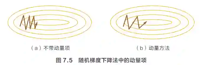中学物理还告诉我们,刻画惯性的物理量是动量,这也是算法名字的由来。沿山谷滚下的铁球,会受到沿坡道向下的力和与左右山壁碰撞的弹力。向下的力稳定不变,产生的动量不断累积,速度越来越快;左右的弹力总是在不停切换,动量累积的结果是相互抵消,自然减弱了球的来回震荡。因此,与随机梯度下降法相比,动量方法的收敛速度更快,收敛曲线也更稳定,如图7.5 所示。