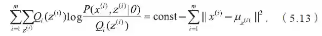 剩下的事情就是说明K 均值算法与EM 算法的关系了。K 均值算法等价于用EM 算法求解以下含隐变量的最大似然问题: