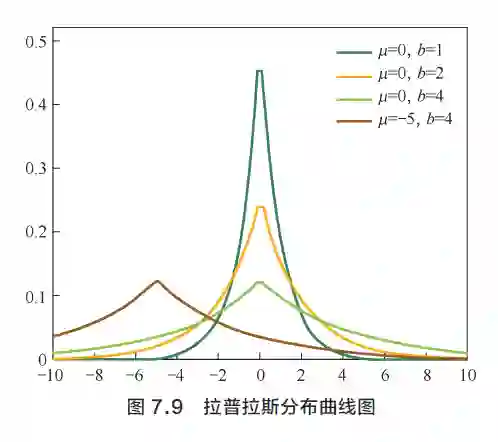 相反,图7.9 是拉普拉斯分布曲线图。由图可见,拉普拉斯分布在极值点(0 点)处是一个尖峰,所以拉普拉斯先验分布中参数w 取值为0 的可能性要更高。在此我们不再给出L1 和L2 正则化分别对应拉普拉斯先验分布和高斯先验分布的详细证明。