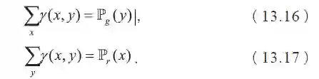 可以看到,当沙子分布和坑分布给定时,我们只关心搬运沙子的整体损耗,而不关心每粒沙子的具体摆放,在损耗不变的情况下,沙子摆放可能有很多选择。对应式(13.16),当你选择一对(x,y) 时,表示把x 处的一些沙子搬到y 处的坑,可能搬部分沙子,也可能搬全部沙子,可能只把坑填一部分,也可能都填满了。x 处沙子总量为,y 处坑的大小为