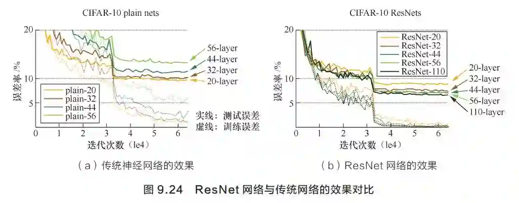 ResNet 可以有效改善深层的神经网络学习问题,使得训练更深的网络成为可能,如图9.24 所示。图9.24(a)展示的是传统神经网络的结果,可以看到随着模型结构的加深训练误差反而上升;而图9.24(b) 是ResNet 的实验结果,随着模型结构的加深,训练误差逐渐降低,并且优于相同层数的传统的神经网络。