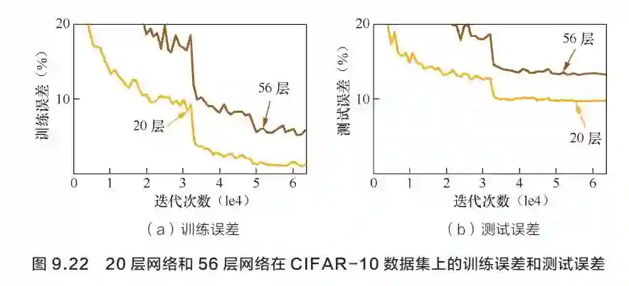 ResNet的提出背景是解决或缓解深层的神经网络训练中的梯度消失问题。假设有一个L 层的深度神经网络,如果我们在上面加入一层, 直观来讲得到的L+1 层深度神经网络的效果应该至少不会比L 层的差。因为我们简单地设最后一层为前一层的拷贝(用一个恒等映射即可实现),并且其他层维持原来的参数即可。然而在进行反向传播时,我们很难找到这种形式的解。实际上,通过实验发现,层数更深的神经网络反而会具有更大的训练误差。在CIFAR-10 数据集上的一个结果如图9.22 所示,56 层的网络反而比20 层的网络训练误差更大,这很大程度上归结于深度神经网络的梯度消失问题。
