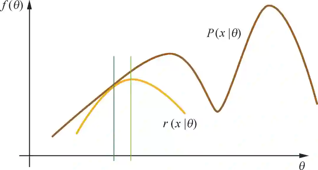 不等式右侧函数记为r(x|θ)。当等式成立时,我们相当于为待优化的函数找到了一个逼近的下界,然后通过最大化这个下界可以使得待优化函数向更好的方向改进。