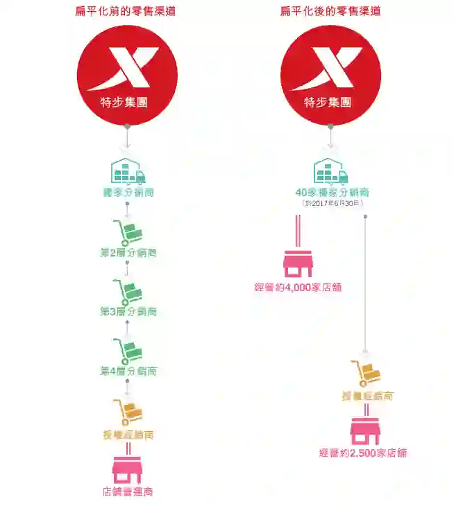 数字化让特步有了渠道变革的基础,原本在品牌与终端门店间的五层“中间商”,被简化至了一层或两层。