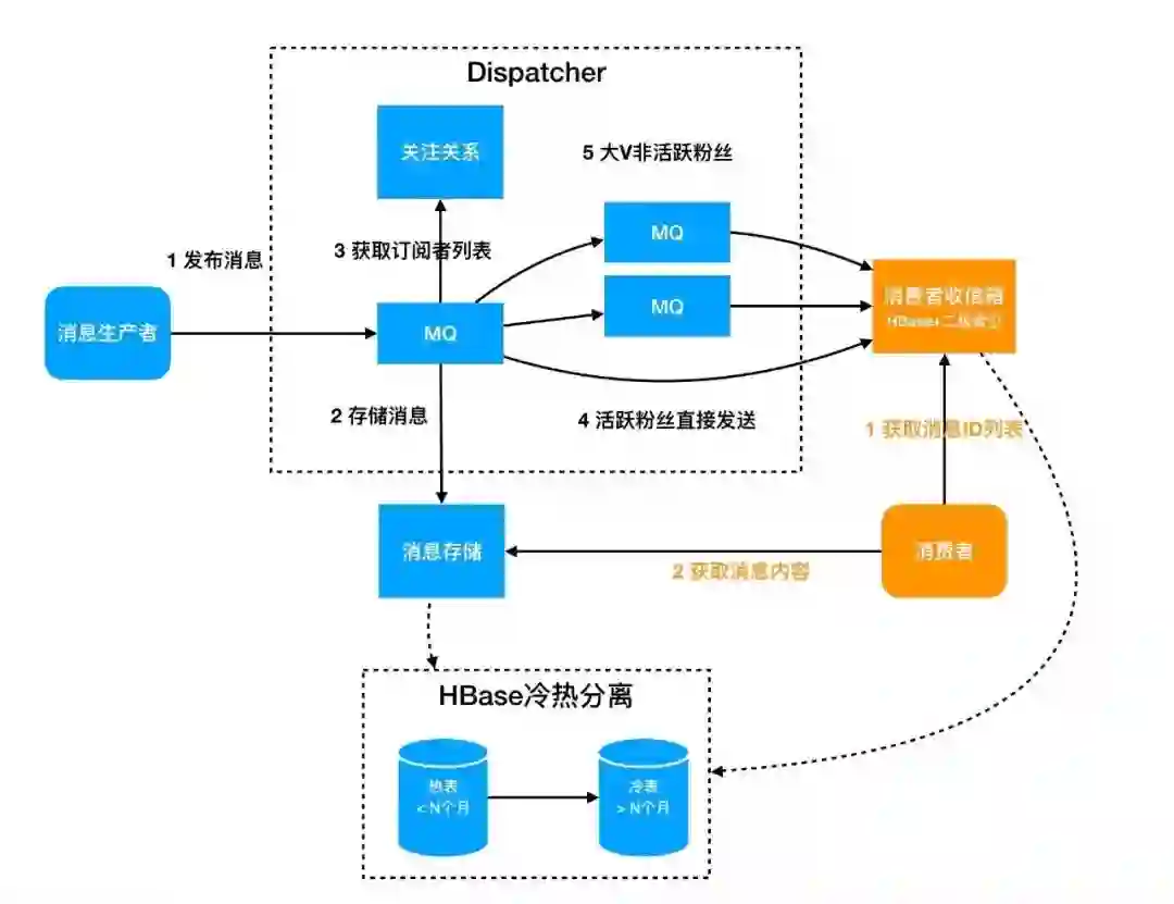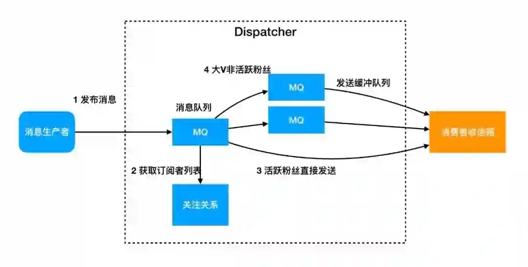 异步化。生产者提交消息首先写入一个队列,成功则表示发布成功,Dispatcher模块会异步的处理消息。这一点非常关键,首先生产者的消息发布体验非常好,不需要等待消息同步到粉丝的收信箱,发布延迟低成功率高;其次Dispatcher可以控制队列的处理速度,可以有效的控制大V账号造成的脉冲压力。