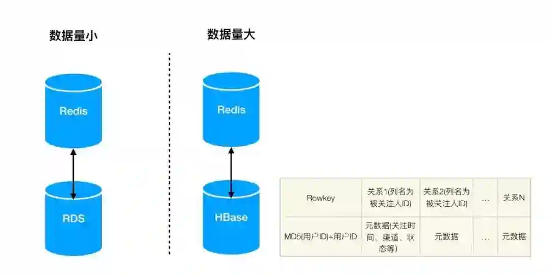 对于关系服务,其写入操作是建立关系和删除关系,读取操作是获取关系列表,逻辑上仅需要一个KV系统。如果数据量较少可以使用RDS,如果数据量较大推荐使用HBase。如果对关系的QPS压力大可以考虑用Redis做缓存。