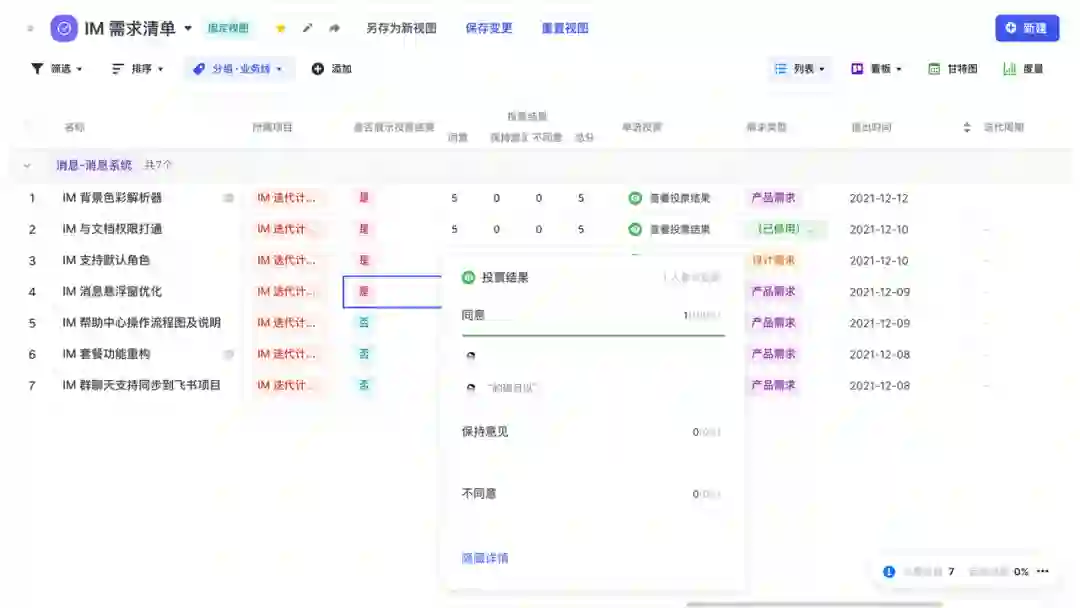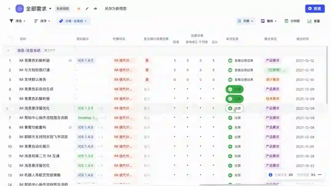对核心场景的需求进行全面的评估时,要加强把控关键流程节点。在节点中引入负责人的同时不忘群策群力的智慧,在项目加入设立【综合评审】的机制,再通过【投票】直接在线收集意见和反馈,提高决策效率,将决策在飞书项目积累,形成闭环,为之后沉淀有价值的信息参考。