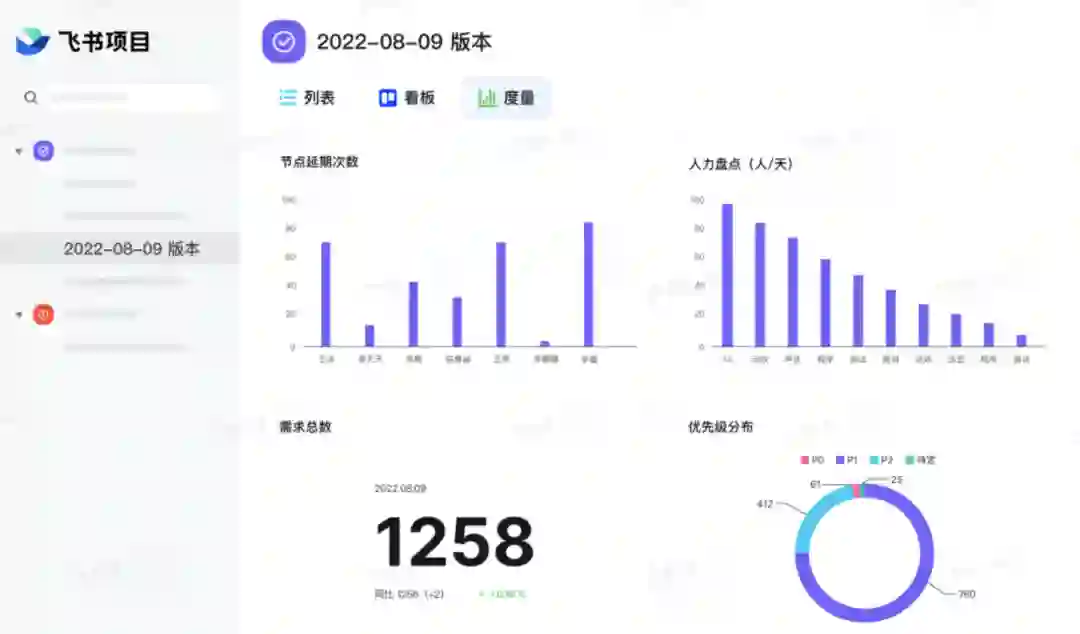 如果在飞书项目中设定 PMO 关心的指标和维度,度量视图功能模块就可以把项目中的数据实时存到原生沉淀在大盘里,不仅高效、清晰、准确地了解项目表现,此刻,PMO 像化身“操盘手”一般,在项目中更加游刃有余地深入分析,来及时响应瞬息万变的市场,提出更多项目优化的方案。
