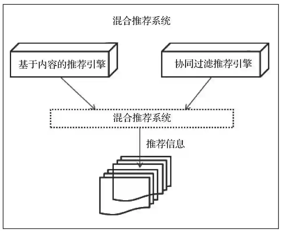 协同过滤推荐系统与基于内容的推荐系统都很有效,适用范围也很广。它们都有很成功的实现,但也有各自的局限性。目前的研究已经开始朝着如何结合协同过滤和基于内容的推荐的方向发展。将这两种推荐系统相结合,产生的新型推荐系统,被称之为混合推荐系统。