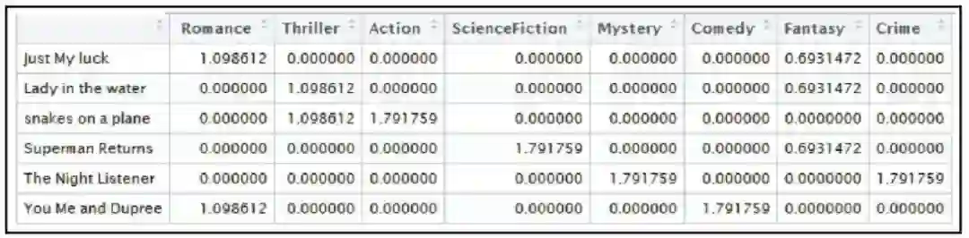 本例中,文档的总数是电影的总数,文档频率指的是它们在所有文档中出现的总次数,如下表所示。