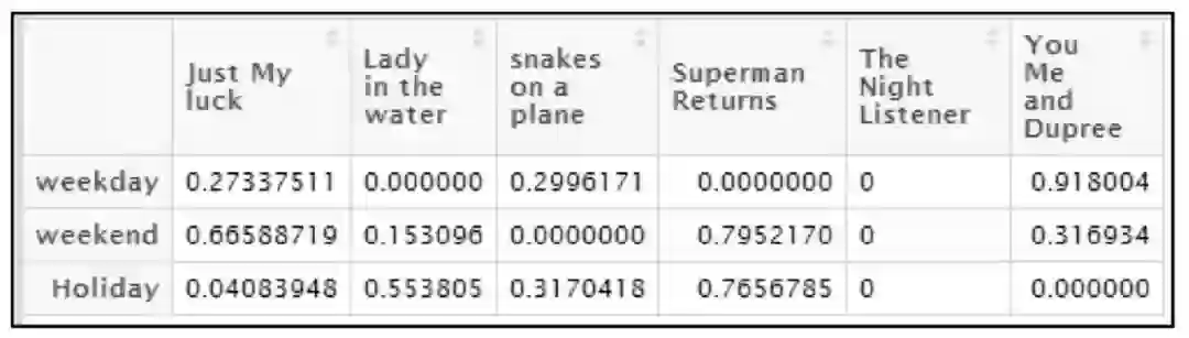 举例说明,假设推荐系统已经收集到用户在不同时间观影的历史数据,类型包括weekday、weekend和Holiday。通过该情境信息,可以分析出每位用户与电影内容之间的关系。如下表所示,表中数据显示用户TOBY在以观影时间类型为情境的前提下,会对哪种电影内容比较感兴趣。