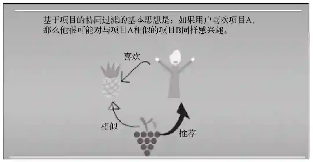 基于项目的协同过滤推荐系统与基于用户的协同过滤不同,它使用项目之间的相似度而不是用户之间的相似度。基于项目的推荐系统的基本思想是,如果用户的历史数据中显示过对项目A喜欢,如果项目B与项目A相似,那么该用户可能也喜欢项目B,如下图所示。