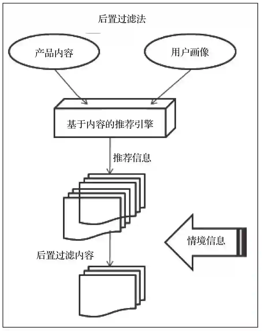 在前置过滤法中,情境信息会被应用到用户画像和产品内容上。这一步会过滤掉所有非相关的特征,最终的个性化推荐会通过剩余的特征集生成。因为特征过滤是在生成个性化推荐之前进行的,所以称这种方法为前置过滤法。如下图所示。