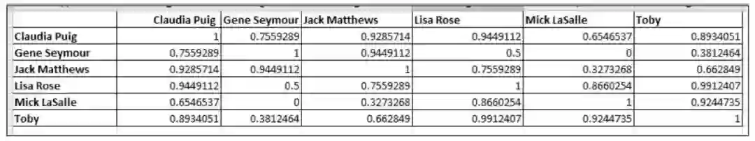 使用前面的公式,我们可以计算表中所有用户之间的相似度,如上表所示。通过观察该表,我们可以发现活跃用户Toby与Lisa Rose最为相似。