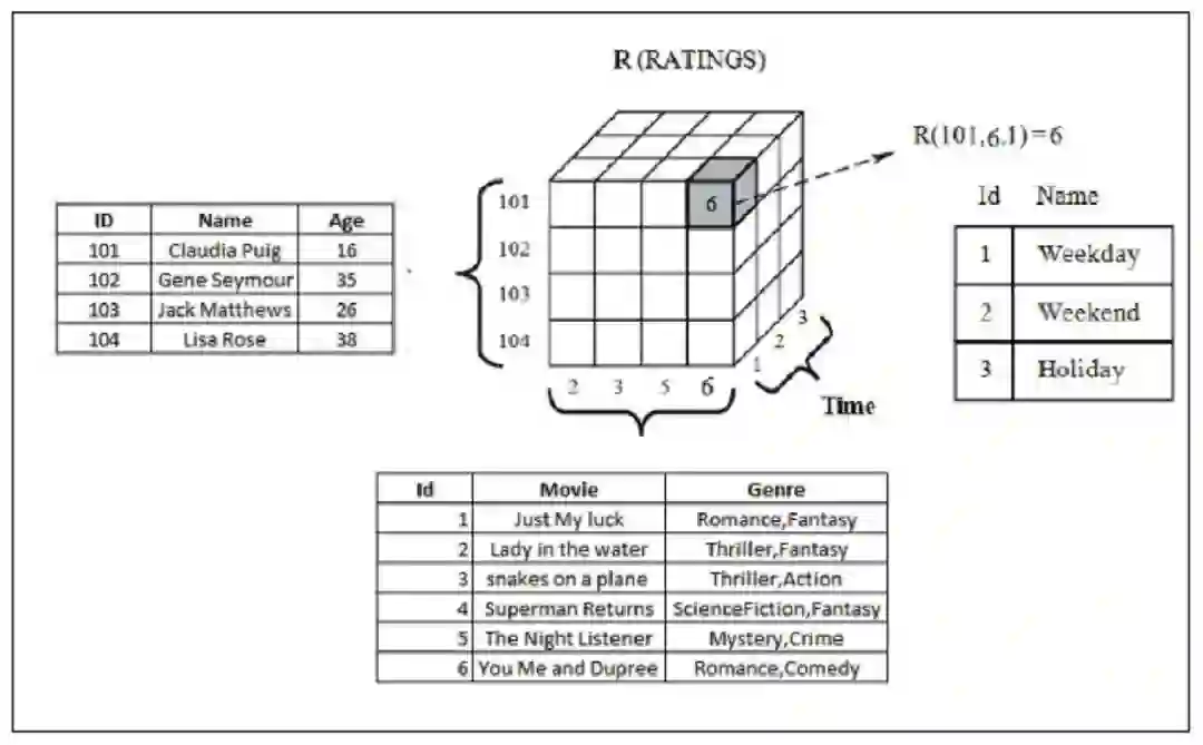 情境感知推荐系统需要如何设计?到现在为止,书中已经介绍的推荐引擎最多是在二维空间中建模,主要是基于用户的偏好和项目特征数据而进行的。而对于情境感知推荐系统来说,它在建模的时候加入了一个新的维度,即分析用户的情境。使推荐引擎从解决二维问题扩展到三维问题,如下图所示。