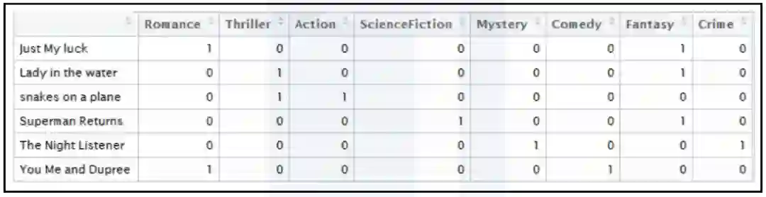 创建一个特征词频矩阵,它通常包含对每个文档中每个特征词的详细统计,引入到本例中,可以理解成每部电影是否属于某一类型。数字1代表属于该类型,而0代表不属于该类型,如下表所示。