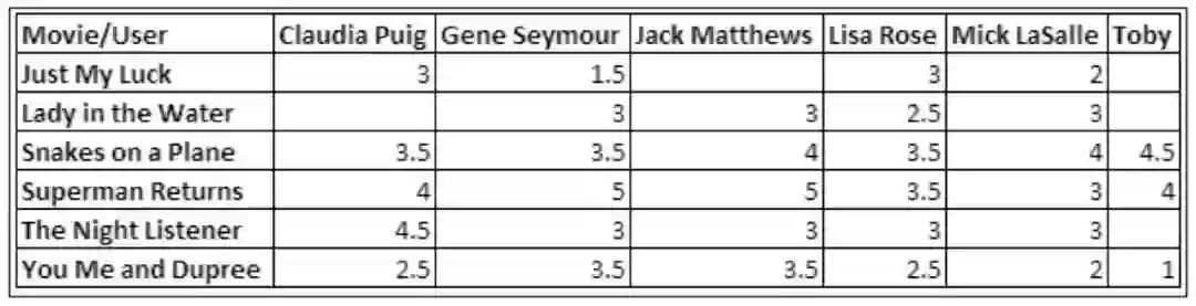 问题陈述:现有用户对电影网站中电影作品的评级数据集。任务是向这些用户推荐电影,数据集如下表所示: