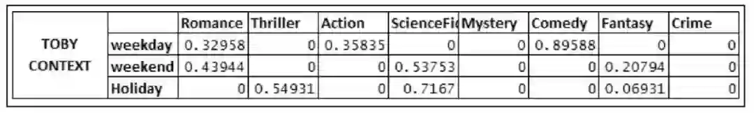 通过对用户数据的分析,参考所有的电影内容类型,可以为用户TOBY构建一个基于内容情境的用户画像。