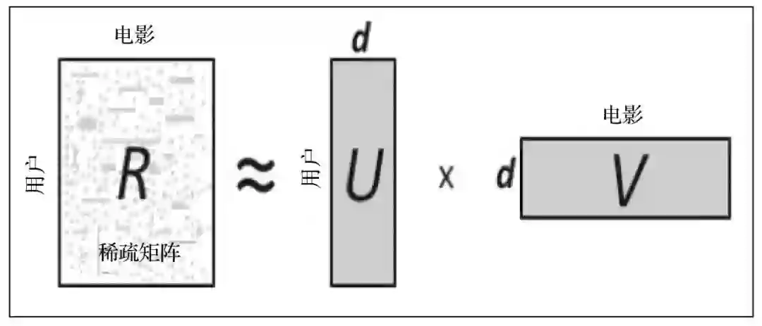 通过应用矩阵分解方法,假设将原有的评级矩阵R分解成两个新的矩阵 ( U,V ),分别代表用户和电影的潜在特征。