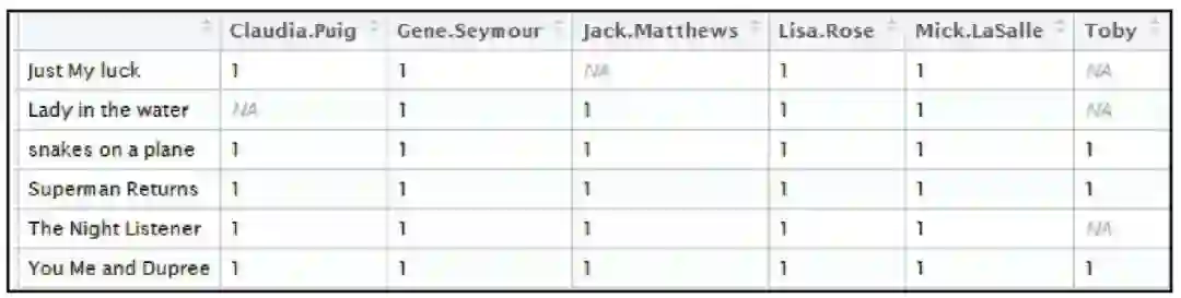 考虑下表中的数据集,该数据集记录了每位用户的历史观影记录。单元格中为1表示用户观看过该部电影。这些信息清晰地说明了用户对电影的偏好。
