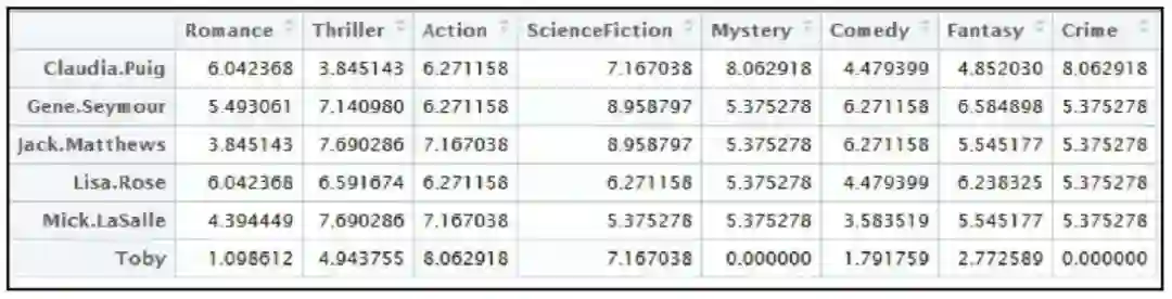 根据前面的信息,我们将创建一个可以用来与项目画像比较的用户画像,也就是说,我们现在要构建一个用户画像,其中包含用户对项目特征 ( 这里是电影类型信息 ) 的偏好。将TF—IDF和用户偏好矩阵求点积,从而得到用户对每种类型电影的亲和度,如下表所示。