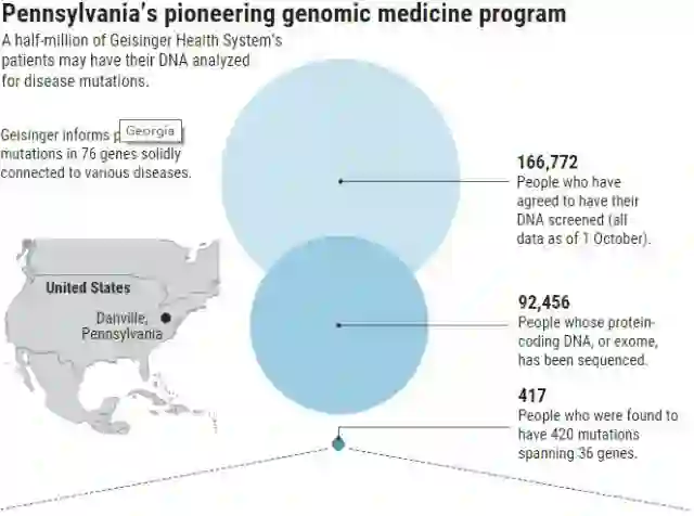 目前,由Geisinger Health System所主持实施的宾夕法尼亚州先驱基因组医学计划(Pennsylvania’s pioneering genomic medicine program)已经对92400人的编码DNA进行了测序,将166000人纳入了他们的研究。