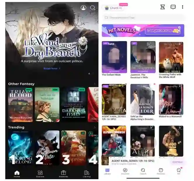 目前,YONDER 共包含主页、探索、福利、书架 4 个一级标签,YONDER 将承担了推荐功能的“主页”作为打开落地页,而区别于 Dreame、GoodNovel 以及 Webfic 等出海网文 App,上述 App 在安装后首次打开的落地页设计均为“书架”。