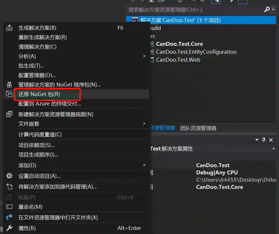 2、在解决方案上,右击,点击还原Nuget包,完成相关引用的还原