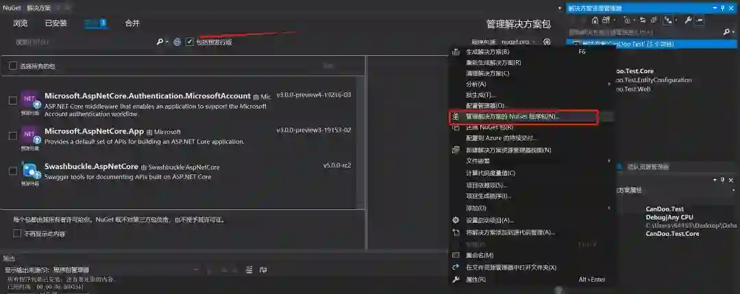 补充说明:OsharpNS正在大力完善中,更新比较快,如果需要更新OsharpNS的引用,请点击在解决方案上,右击,点击管理解决方案的Nuget程序包...,切换到更新标签,勾选包括预发行版(因为OsharpNS处于预发行状态,只更新Osharp相关的即可,其他的预发行的包别去用)