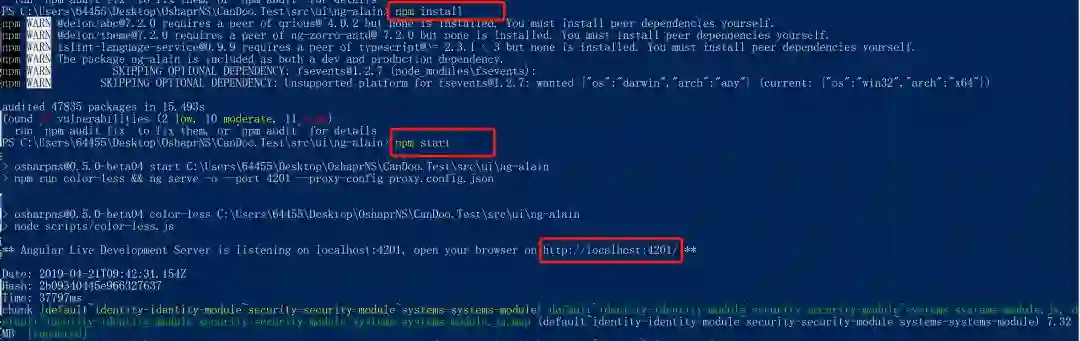 6、包安装完成后,输入项目启动命令npm start,如果运行成功,在浏览器中输入http://localhost:4201/就能看到界面了