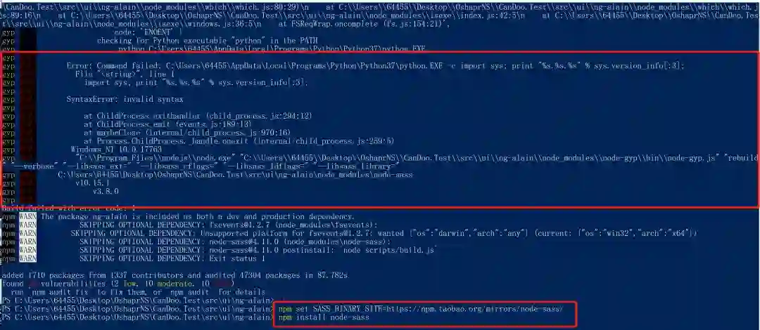 8、执行npm install时候出现错误,注意看下Python的Path路径是否配置了(我本地是装好Python并且配置好Path的),但是安装时候还是出错了,解决时参考的文档:https://blog.csdn.net/ztz87/article/details/81734916 ,查看错误信息是node-sass安装失败,我执行了设置淘宝镜像npm set SASS_BINARY_SITE=https://npm.taobao.org/mirrors/node-sass/,再次运行npm install node-sass,安装成功