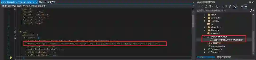 4、打开appsettings.Development.json,对数据库连接串根据实际进行修改(appsettings.json为正式发布时使用的配置文件,调试时使用的是appsettings.Development.json,请注意区分)