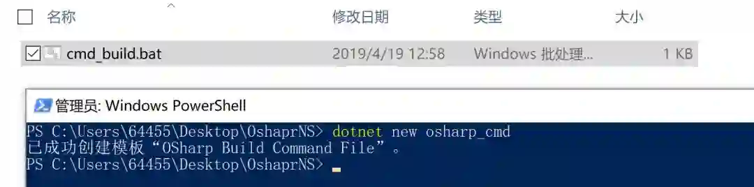 2、执行命令dotnet new osharp_cmd获取Osharp安装脚本,执行完成后,目录中出现cmd_build.bat文件