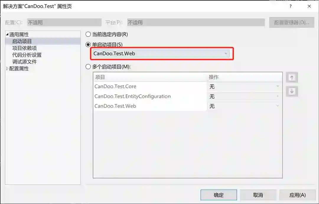 3、在解决方案上,右击,点击属性,更改启动项目为CanDoo.Test.Web