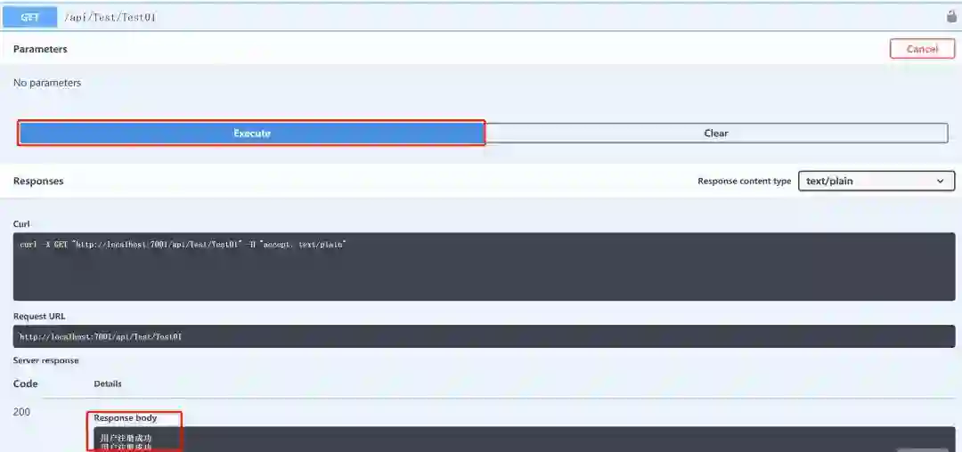 1、将系统运行起来后,看到Swagger界面,找/api/Test/Test01,点击后展开查看接口信息