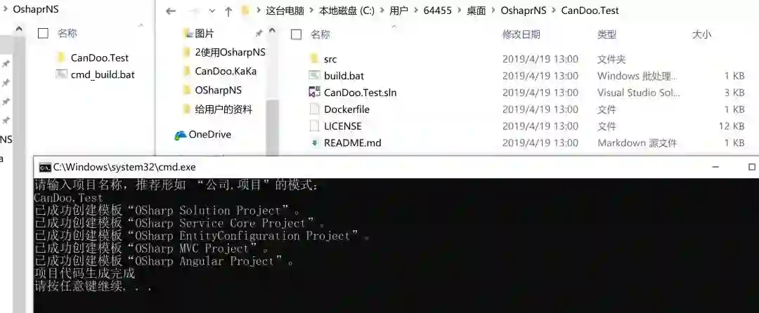 3、双击cmd_build.bat,并根据要求命名项目名称(也可以根据喜好对项目进行命名,本示例使用CanDoo.Test作为项目名称),完成项目创建