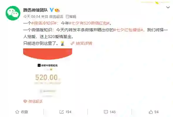 8月25日讯,腾讯微信团队昨天通过官方微博提醒,七夕节期间,微信红包的上限提高到了520元。从昨天0点开始,一直持续到23:59,微信普通红包的单个金额上限由 200 元上调到 520 元。(PingWest品玩)
