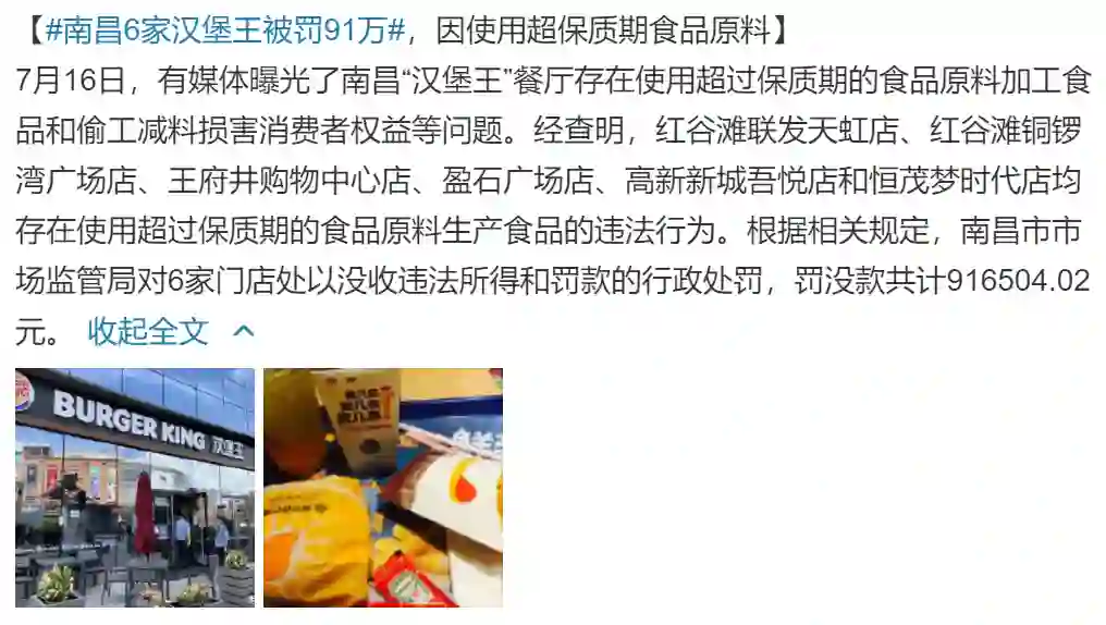 7月16日,有媒体曝光了南昌“汉堡王”餐厅存在使用超过保质期的食品原料加工食品和偷工减料损害消费者权益等问题。经查明,红谷滩联发天虹店、红谷滩铜锣湾广场店、王府井购物中心店、盈石广场店、高新新城吾悦店和恒茂梦时代店均存在使用超过保质期的食品原料生产食品的违法行为。根据相关规定,南昌市市场监管局对6家门店处以没收违法所得和罚款的行政处罚,罚没款共计916504.02元。(澎湃新闻)