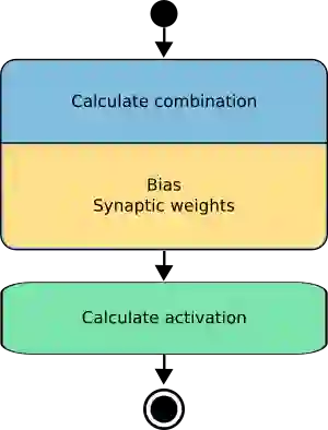 组合函数通过输入向量x生成组合值或净输入c。 感知机中,组合由偏移加上突触权重和输入的线性组合计算得到,