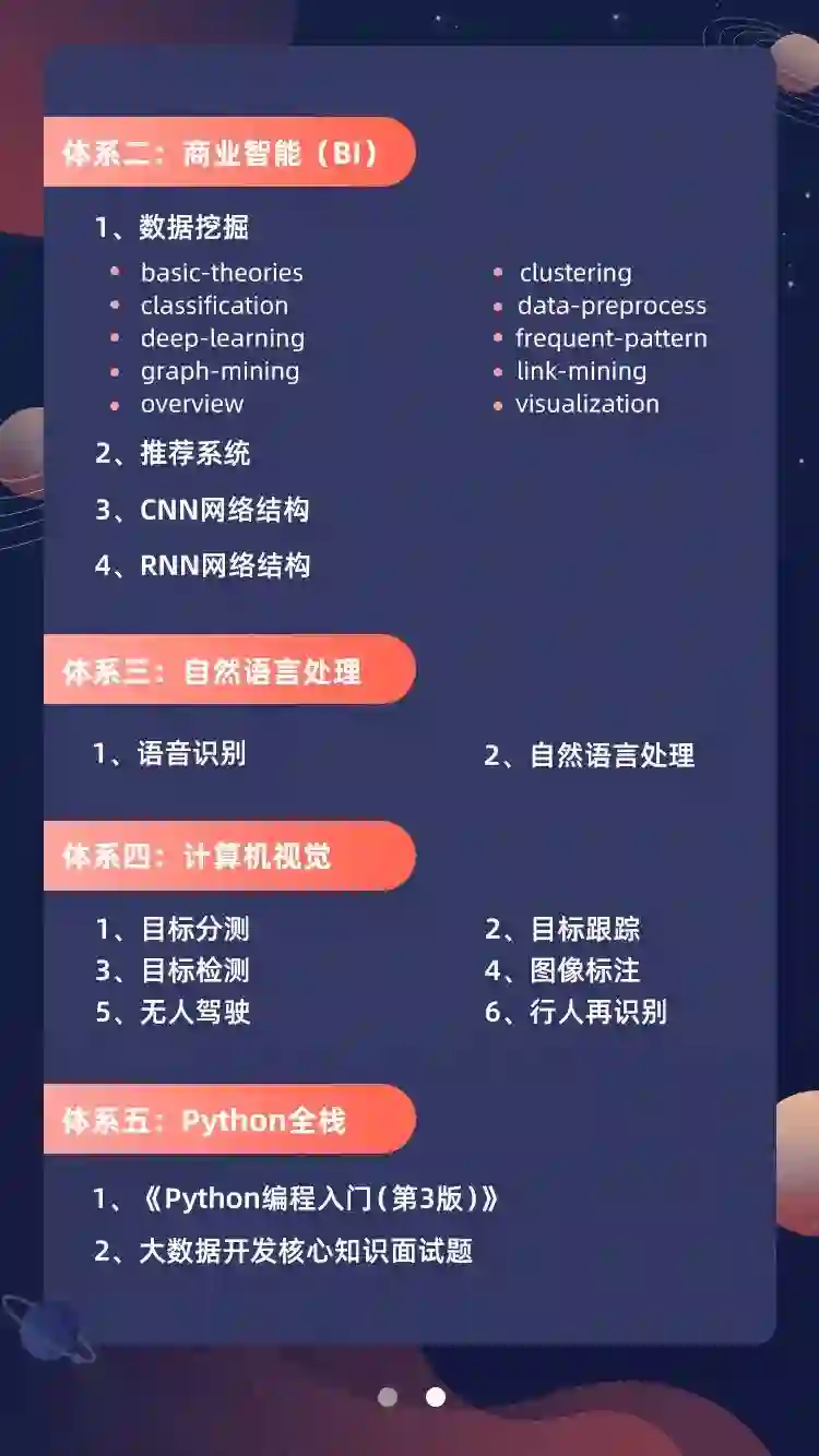 包含人工智能与机器学习、商业智能(BI)、自然语言处理(NLP)、计算机视觉(CV)、Python全栈5个大类。