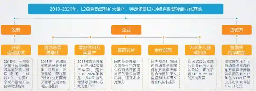 下面这张图说明自动驾驶真的不是什么天方夜谭了,产业、政策、技术形成合力,实际应用推进的速度很快。预期2019、2020年迎来L2级自动驾驶的量产及特定场景L3/L4级自动驾驶商业化落地。