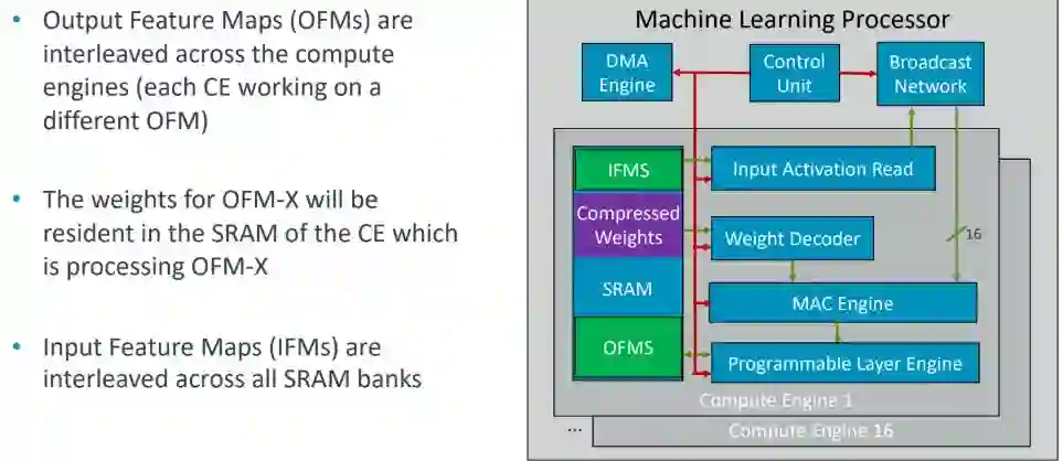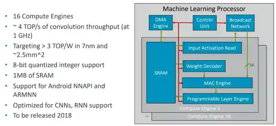 搭建架构的模块是计算引擎,每块为64 KB的SRAM片,共16块。 MAC引擎(与英伟达的TensorCore不同)是执行卷积化的地方,可编程层引擎负责处理网络各层之间的大部分必要的shuffling。该架构具有DMA引擎,用于与外部存储器接口进行通信。 ARM自己的Cortex技术负责的引擎控制。